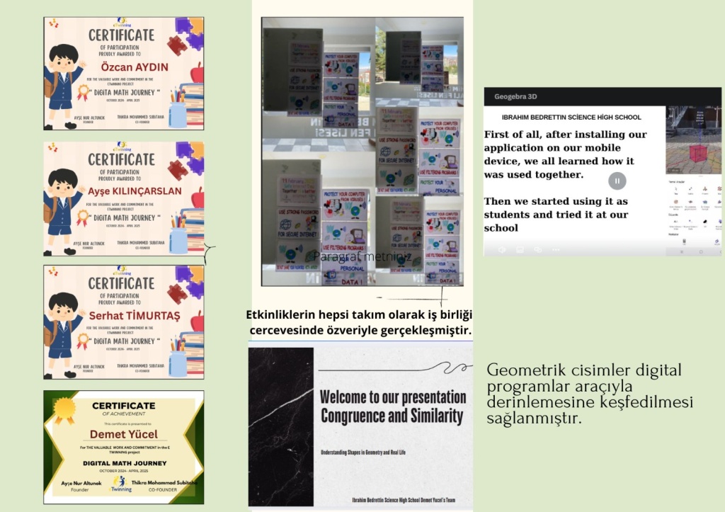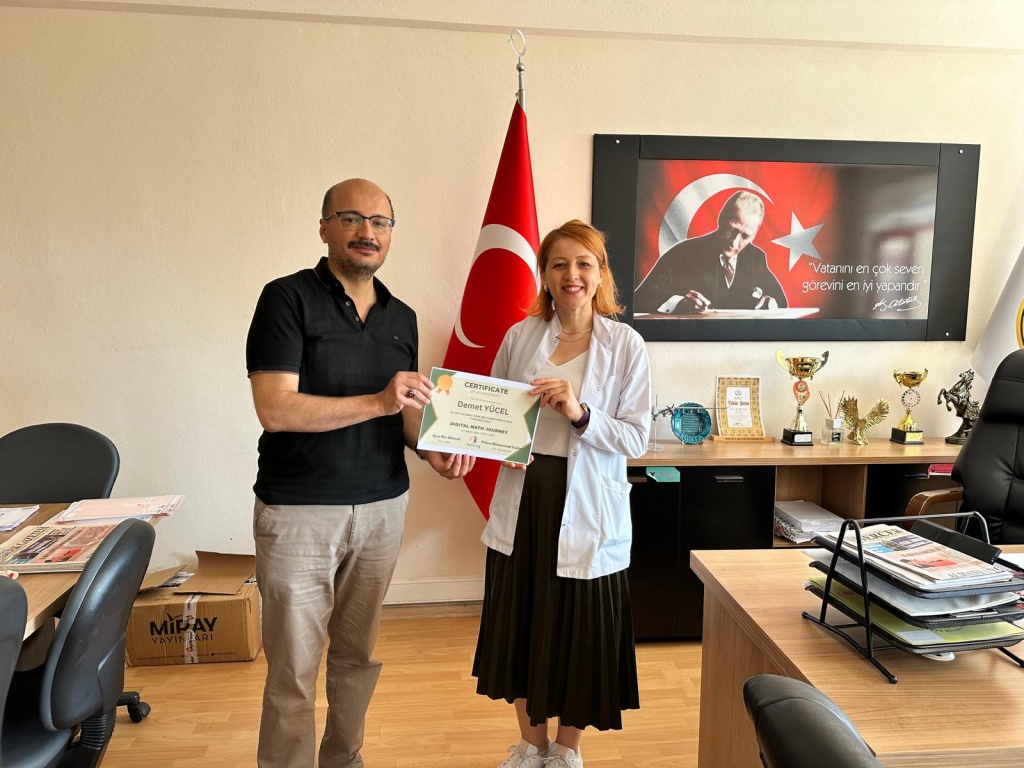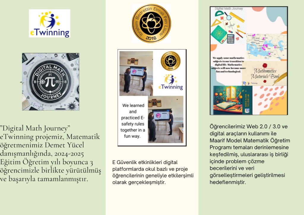Digital Math Journey e-Twinning Projemiz, Matematik öğretmenimiz Demet YÜCEL danışmanlığında, 2024-2025 Eğitim-Öğretim yılı boyunca üç öğrencimizle birlikte yürütülmüş ve başarıyla tamamlanmıştır.